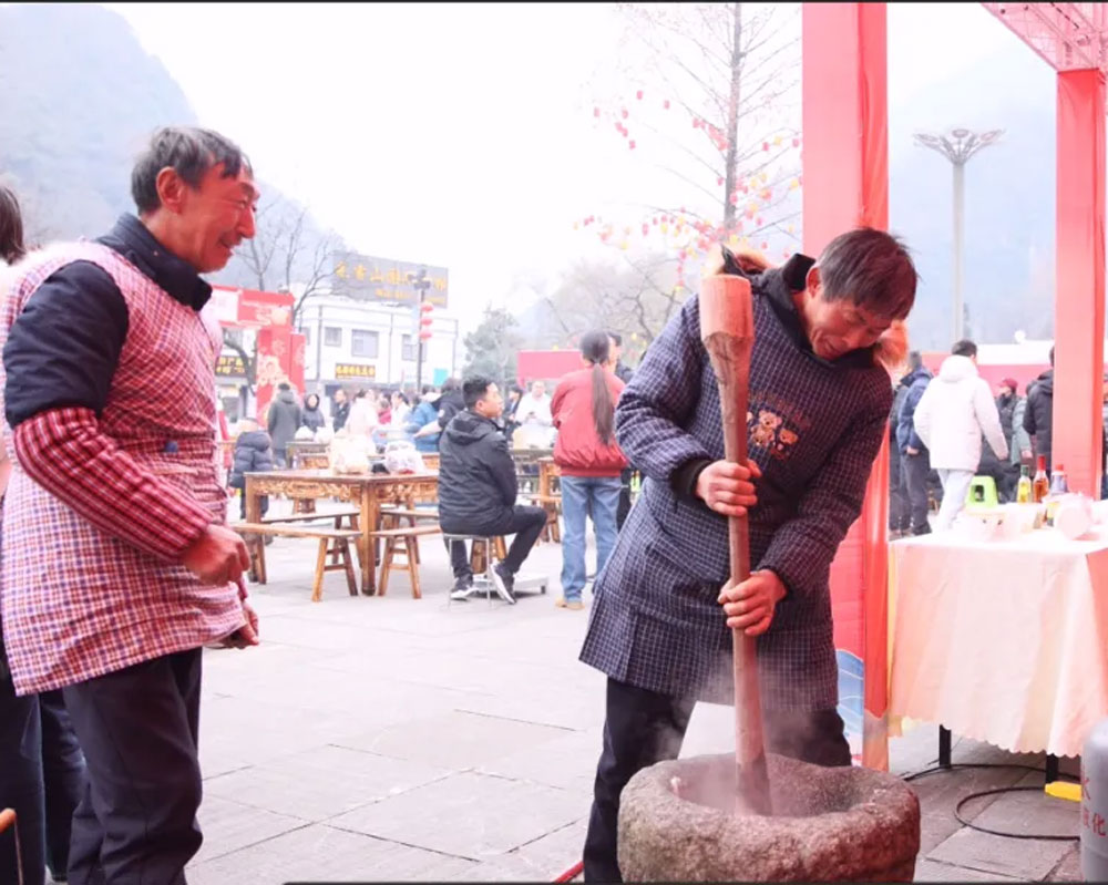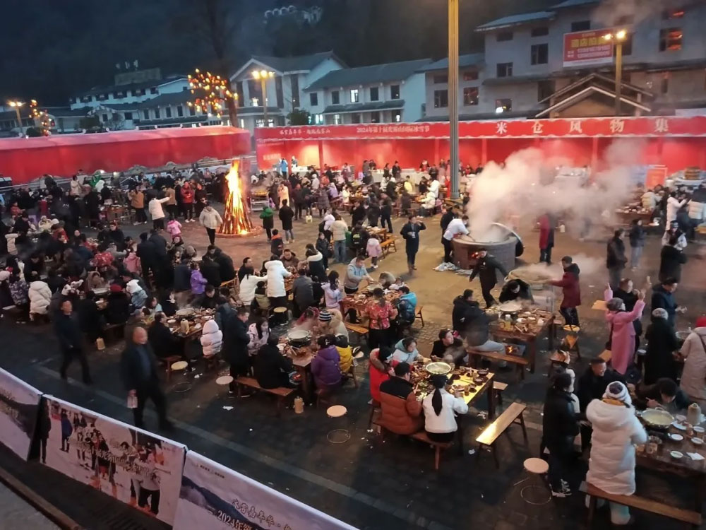 中午時分,一場極具當地特色的千人壩壩宴(庖湯宴)率先拉開歡樂序幕。現場人聲鼎沸,長桌一字排開,擺滿了熱氣騰騰的 “庖湯” 美食。新鮮出鍋的豬肉、軟糯入味的血旺、香脆可口的炸酥肉…… 每一道菜都散發著濃濃的家鄉味,大家圍坐在一起,共享這份冬日里的溫暖,歡聲笑語回蕩在山間,好不熱鬧。